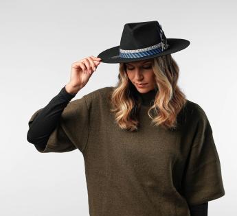 精巧に作られた羽根が宝石のような羽根ホルダーに滑り込み、往年の優雅さを彷彿とさせます。銀色の刺繍風のディテールが光と立体感を加えます。職人技と創造的表現が融合した、特別な帽子です。