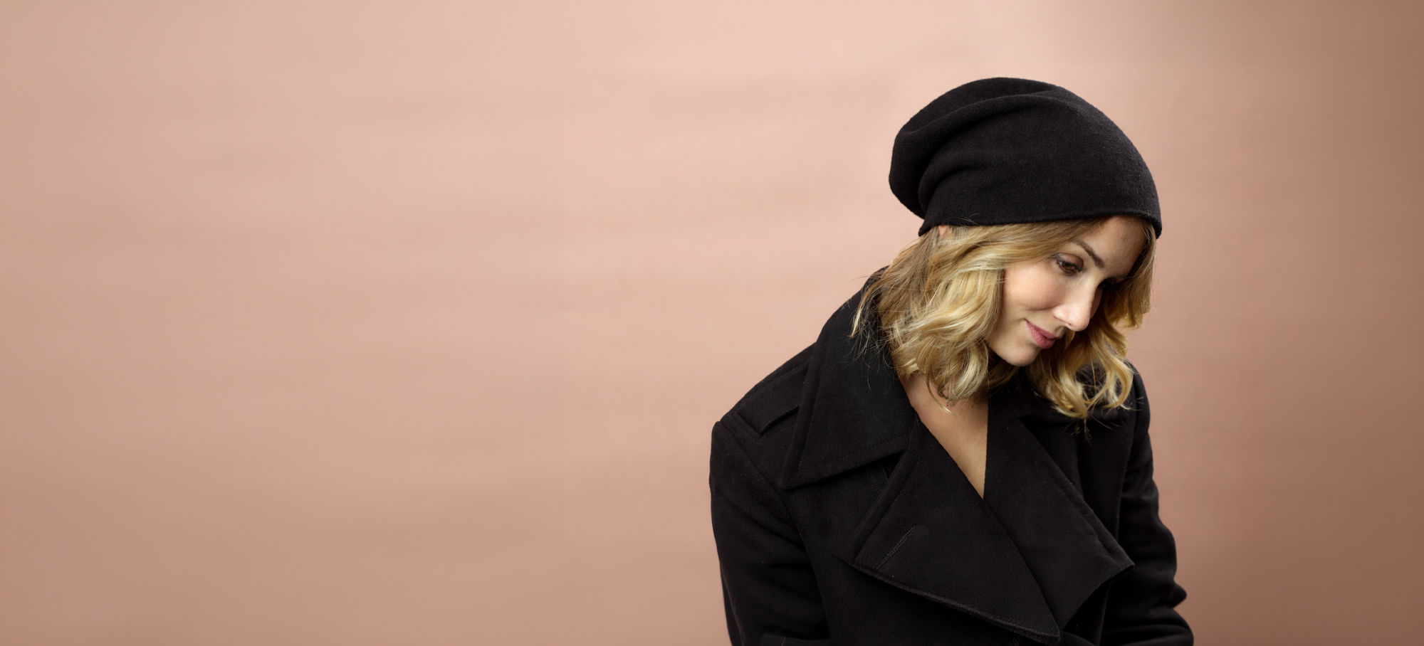 黒のニット帽は、構築的なコートにもカジュアルな装いにもマッチ。都会でも自然の中でも、エレガンスとナチュラルさを絶妙に繋ぎます。
