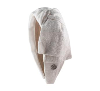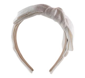 アトリエで仕立てられたこのヘッドジュエリーは、ヘアバンドとターバンの絶妙なバランスを叶えます。サイドにさりげなくアシンメトリーなリネンのダブルツイストノットが、堅苦しさのない独自のエレガンスを演出。