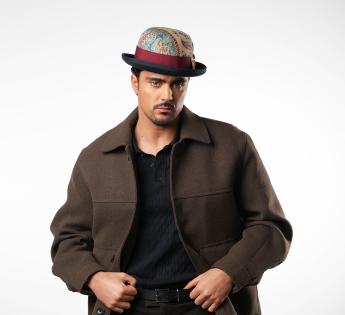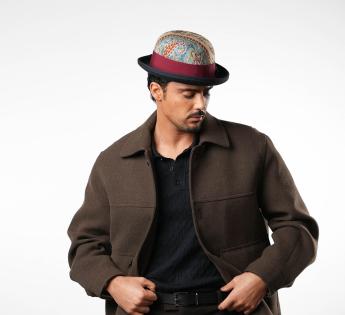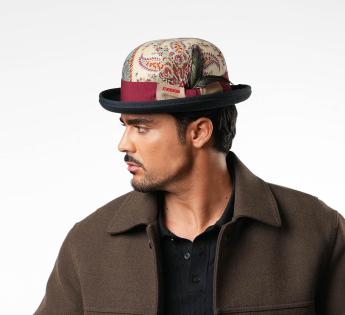 限定版の目玉商品であるこのボーラーハットは、ヴィンテージのペイズリー柄の生地で覆われ、その独特な魅力で際立っています。各アイテムは異なるパターン配置を特徴としており、各ハットが真にユニークです。丁寧に作られたトリムは、二色のブレードと緑とバーガンディの色合いを持つ雄鶏の羽で強調され、大胆で洗練されたシルエットを描きます。