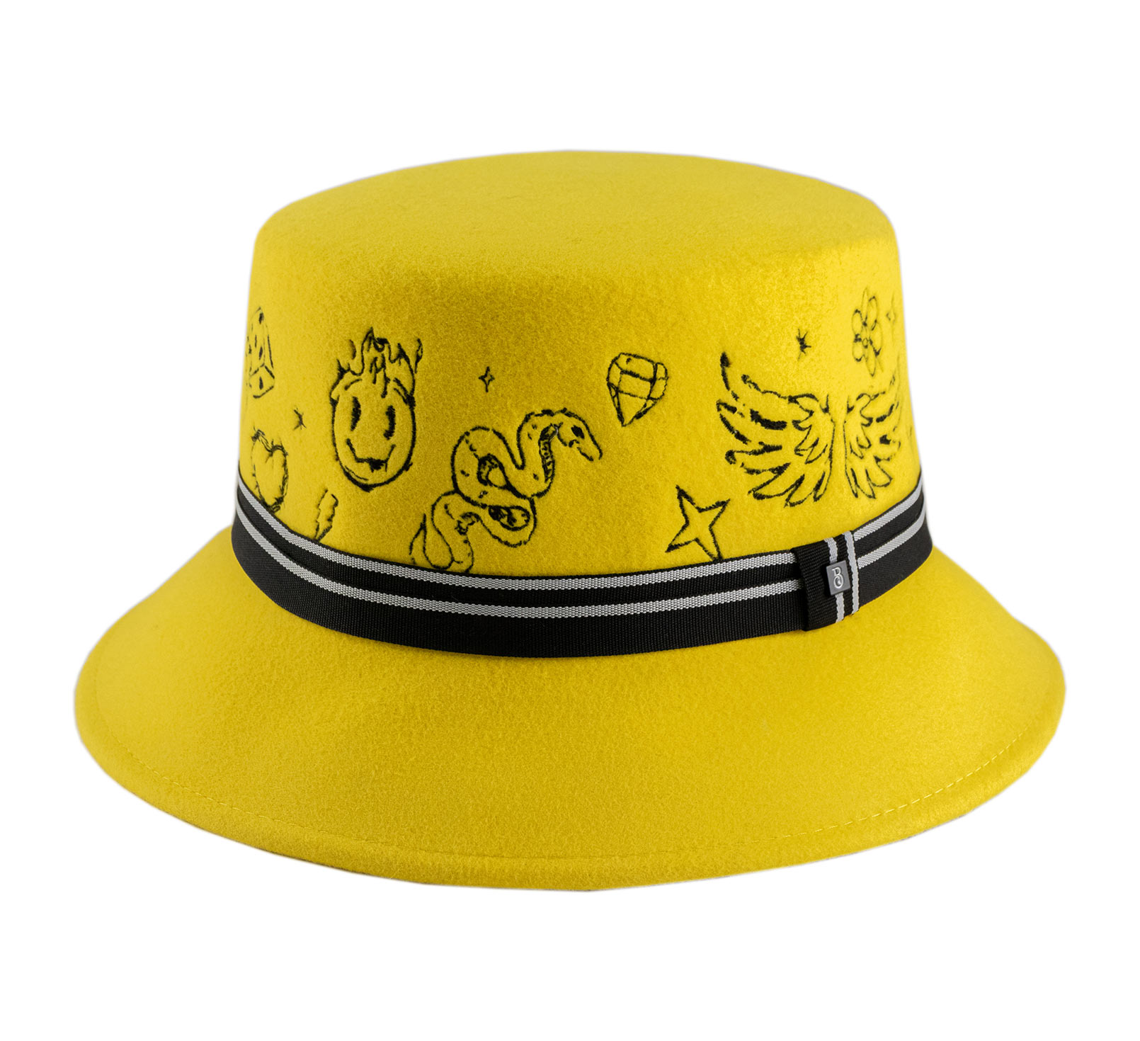 カラフルで大胆、そしてウルトラクリエイティブなこのウールフェルトのボブハットは、帽子のコードを再発明します。平らなクラウンは、タトゥーのようなグラフィックパターンで完全に刺繍され、ストリートでユニークなタッチを加えます。ストライプのブレードが全体を構成し、中央の金属製の正規ロゴで強調されています。このモデルはすべての目を引き、本当のスタイルの自由を主張します。