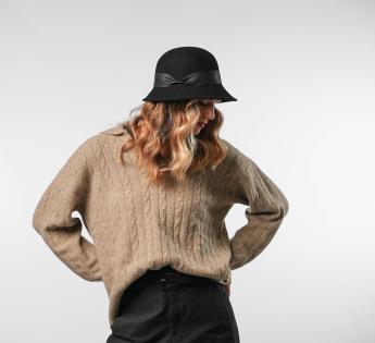 シックでフェミニンなこのクロシェハットは、フェルトウールで作られたレトロなラインと包み込むシルエットが魅力です。柔らかい革のトリムがアクセントとなり、全体に品格を与えています。