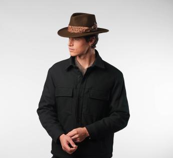 エレガンスと個性の完璧な融合、このトラベラーハットはリヨンの工房で職人の手によって丁寧に作られています。フェルトの色合いに合わせたブレードが特徴で、繊細なアラベスク模様で飾られています。部分的にわずかに光沢があり、微妙なベルベット効果で光を捉え、帽子のシルエットを豊かにします。